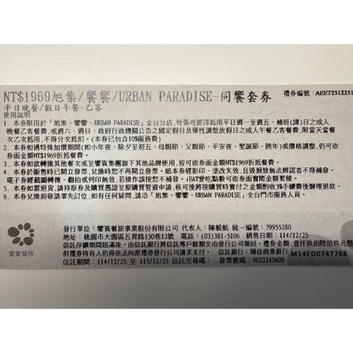 2.本券如遇特殊加價節日(如春節除夕~初五、平安夜、聖誕節、跨年等)或價格調整,仍可依券面商品金額T$1969折抵餐費