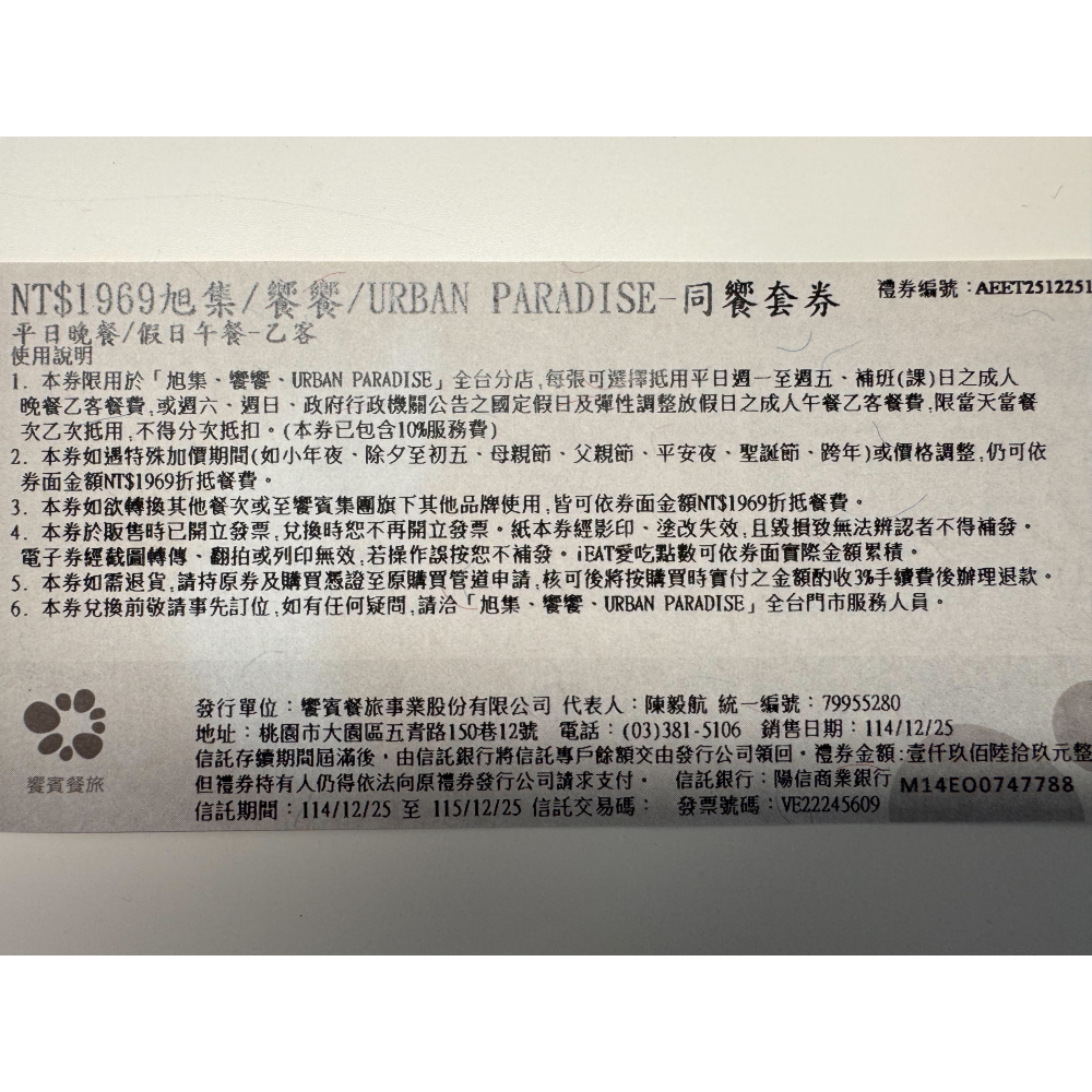 1.本券限用於「饗饗、旭集」全台分店,每張可選擇抵用平日週一至週五、補班、補課之週六、週日晚餐乙客餐費,或週六、週日、國定假日及彈性調整放假日之成人午餐乙客餐費,限當天當餐次乙次抵用,不得分次抵扣·(本券已包含10%服務費)