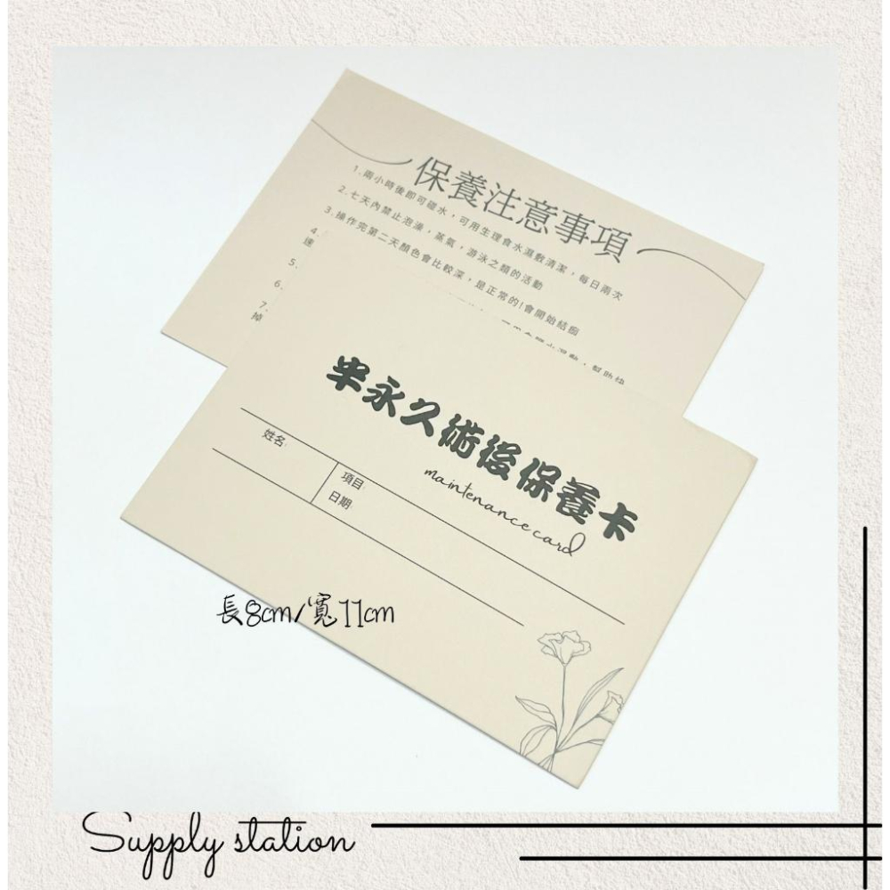 尺寸:8*11cm 可以給客人提醒施作的時間跟項目 背面有保養注意事項 50張$ 200 圖案是本店自己設計的!奶茶色很耐看喔
