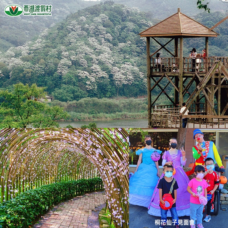 有「油桐花的故鄉」之美稱的西湖渡假村,在每年四至五月間的油桐花季節裡,落花繽紛如雪,遊客絡繹不絕。夜宿西湖,最能欣賞到油桐花盛開之美;清晨時分,美麗的油桐花滿滿的灑落一地,陽光穿過樹梢,調皮的在林蔭間跳躍,整個林地像是被雪覆蓋一般,呈現粉嫩春色。或者,可以到觀湖樓登高遠眺仿若青山白了頭;或是親臨湖畔,踩船遊湖,感受西湖映雪的美景。各展風情、各異其趣的賞桐方法,十分值得體驗。