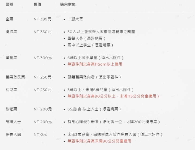 凡進入本園區範圍(含綠色峽谷),均依以上公告票價收費,如有異動請依官方平台及現場公告為準。