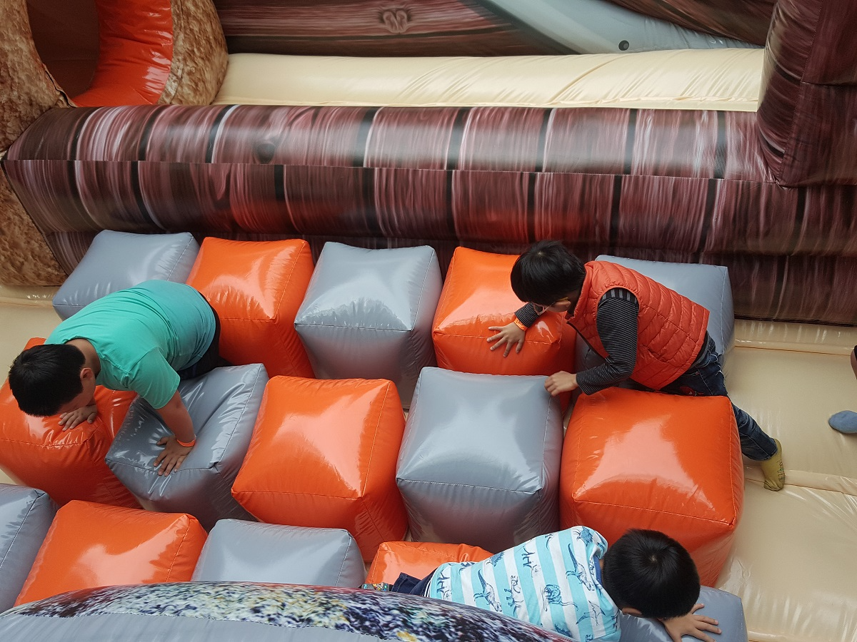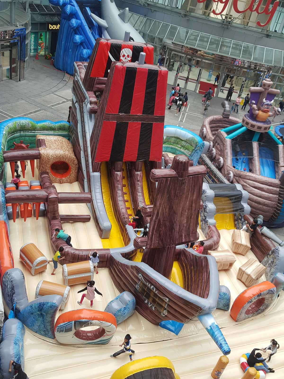 #海盜船 設施與#巨無霸氣墊 遊戲完美融合,完整呈現真實海盗船上的各種場景,臨場感探險性十足給小朋友們宛如乘風破浪的驚險刺激體驗。可同時容納100人以上遊玩。海盗船分為中央桅桿有兩個高達4m和6m的大滑梯,左右障礙區還包括藏寶箱、木箱、魔術方塊台、拳擊柱等障礙路線...,適合幼童及小學生使用。海盜主題大型氣墊遊戲樂園巡迴展,再次強勢回歸雙北千萬別錯過哦!