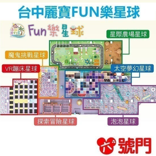1、每張票券可一大一小全區全日𣈱玩台中麗寶【Fun樂星球】(六歲以下需全程陪同一位大人入場)。