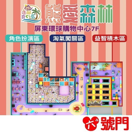 1、本券可1大1小全區全日𣈱玩屏東環球購物中心7F 追風奇幻島 【熊愛森林】(六歲以下需全程陪同一位大人入場)