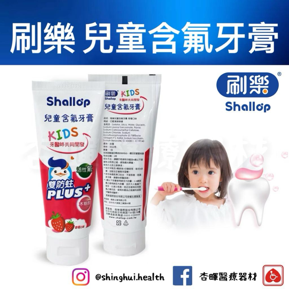 ❰免運❱ 日本 Shallop  刷樂 兒童含氟牙膏-草莓口味 90g 牙膏 SAD-S090-1 口腔護理 抗敏護齦 預防蛀牙 ✅實體店面 ✅原廠公司貨 ✅合法藥商許可 https://s-cf-tw.shopeesz.com/file/tw-11134208-81ztc-mei6lwrzhh4xf7 https://s-cf-tw.shopeesz.com/file/tw-11134208-81zto-mei6m60shkw02d https://s-cf-tw.shopeesz.com/file/tw-11134208-81ztm-mei6m614464h3e https://s-cf-tw.shopeesz.com/file/tw-11134208-81ztg-mei6m6283y8150 https://s-cf-tw.shopeesz.com/file/tw-11134208-81ztd-mei6m62rqhvpa8 https://s-cf-tw.shopeesz.com/file/tw-11134208-81zti-mei6m63afbwgcb https://s-cf-tw.shopeesz.com/file/tw-11134208-81ztd-mei6m63l2sxz93 https://s-cf-tw.shopeesz.com/file/tw-11134208-81zti-mei6m64ef400ea https://s-cf-tw.shopeesz.com/file/tw-11134208-81ztd-mei6m64gkd8k5b https://s-cf-tw.shopeesz.com/file/tw-11134208-81zti-mei6m64qld6s37 https://s-cf-tw.shopeesz.com/file/tw-11134208-81ztm-mei6m66e0o3led 【常見問題 Q&A】 Q:兒童牙膏含氟量應該多少,才有效預防蛀牙? 氟元素是醫學研究中被證實具有相當程度的防蛀牙效果。 衛福部及牙醫師口腔疾病預防宣導,建議兒童使用含氟量達1000ppm牙膏,才能有效預防蛀牙。   Q:小孩多大可以用牙膏呢? 建議當小朋友可以學習漱口吐出時,即可使用牙膏清潔牙齒,減少蛀牙發生。   Q:小朋友牙膏使用量? 2歲以下孩童使用綠豆大的量;2-6 歲孩童之使用豌豆大的量。 若正在使用任何含氟之補充品,使用本產品之前請先諮詢牙醫師或醫師。   Q:兒童牙膏甜甜的會不會蛀牙? 刷樂兒童含氟牙膏的甜味來自於「木糖醇」,Xylitol木糖醇 是一種具有預防蛀牙效果的甜味劑,可中和口中酸鹼值,促進唾液分泌,達到預防齲齒效果。 這種微微的甜味也能讓小朋友比較喜歡用牙膏刷牙。     商品規格 商品名稱 刷樂 兒童含氟牙膏-草莓口味 商品編號 SAD-S090-1 規格 90g/入 產地 台灣 有效期間 3年,依商品上標示日期為主 注意事項 1. 2歲以下孩童使用綠豆大的量;2-6 歲孩童之使用豌豆大的量,且於大人監督下刷牙,以減少吞食。若正在使用任何含氟之補充品,使用本產品之前請先諮詢牙醫師或醫師。 2. 不宜吞食牙膏,若不慎誤食,請儘快就醫諮詢。 3. 請置於乾燥陰涼處保存,避免陽光直接曝曬 【販賣藥商許可執照】 ✔️販售業者資料: ✔️許可證字號:雲縣藥販 字第6239012863號 ✔️公司名稱:杏暉醫療器材行 ✔️地址:雲林縣斗六市雲林路二段623號 ✔️諮詢專線:05-5370788 📍服務時間:週一至六8:30-17:00  📍消費者使用前應詳閱產品說明書
