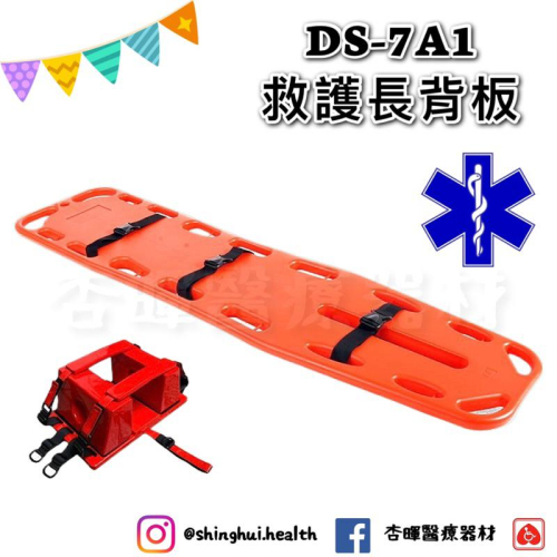 ❰免運❱ DS-7A1 救生長背板 擔架配件 擔架 救護車 醫院 診所 公司貨 急救 擔架 長背板 ✅實體店面 ✅原廠公司貨 ✅合法藥商許可 Feature of product 📍產品說明 ▫️產品名稱:DS-7A1長背板 顏色:橙色 ▫️材質:HDPE強化塑 ▫️承載重量:181 kg ▫️產品尺寸:184x45X6 cm ▫️擔架重量:8 kg ▫️出貨配件:: (1)擔架本體x1 (2)塑扣安全帶X3 ▫️可在水上漂浮 ▫️可進行X光透視CT掃描 ▫️可結合頭部固定器使用 📍產品特點 加購配件 ▫️頭部固定器 ▫️蜘蛛式安全帶 ▫️金屬扣安全帶 📍產品特點 ▫️可於水上漂浮 ▫️可進行X光透視、CT掃描 ▫️可結合頭部固定器使用 ▫️多種安全帶系統可選購 https://s-cf-tw.shopeesz.com/file/tw-11134208-7qul7-litlzuz2yp4k39 📍醫療器材許可證 ▫️中 文 品 名:“德盛”手提式擔架 (未滅菌) ▫️英 文 品 名:"D. S RESCUE" Hand-carried stretcher (Non-Sterile) ▫️核 准 字 號:衛部醫器陸輸壹字第004537號 ▫️醫療器材商名稱:德盛有限公司 ▫️醫療器材商地址:桃園市龜山區大崗里新興街314號 ▫️製造廠名稱:MCN2528000 JIANGSU RIXIN MEDICAL EQUIPMENT CO., LTD. ▫️製造廠地址:NO.427 YANGJIN ROAD, JINFENG, ZHANGJIAGANG JIANGSU, CHINA ▫️醫 材 等 級:第一級 ▫️有效期間或保存期限:詳見產品包裝標示 【販賣藥商許可執照】 ✔️販售業者資料: ✔️許可證字號:雲縣藥販 字第6239012863號 ✔️公司名稱:杏暉醫療器材行 ✔️地址:雲林縣斗六市雲林路二段623號 ✔️諮詢專線:05-5370788 📍服務時間:週一至六8:30-17:00  📍消費者使用前應詳閱產品說明書