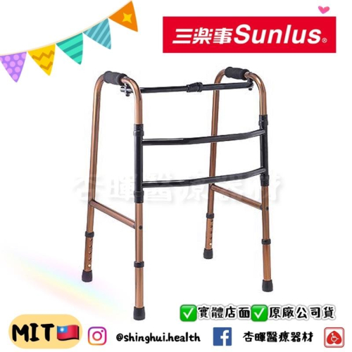 ❰免運❱ 三樂事 Sunlus 移動式型助行器 SP5608 台灣製 鋁合金 助行器 輔具 補助 ✅日本御用款式🇯🇵 ✅實體店面 ✅原廠公司貨 ✅合法藥商許可 📍產品特色 ▫️本體尺寸 : 44cm x 53cm x 81~91cm ▫️本體體重 : 約2.65 kg ▫️商品顏色 : 銅色 📍產品規格 ▫️材質:本體 鋁 ▫️產地:台灣 ▫️保固:一年 ▫️衛部醫器製壹字第006519號 ▫️北市衛器廣字第106070139號 衛部醫器製壹字第006519號 醫療器材級數 第一等級 中文品名 三樂事 機械式助行器 (未滅菌) 英文品名 Sunlus Mechanical walker (Non-Sterile) 效能 限醫療器材管理辦法「機械式助行器(O.3825)」第一等級鑑別範圍。 限制項目 01國 產 申請商名稱 6201124590 昌豐國際股份有限公司 申請商地址 台北市南港區忠孝東路六段21號13樓之3 製造廠名稱 6136191196 聖侑企業股份有限公司 製造廠廠址 台中市太平區光隆里光興路479號1樓 製造廠國別 TAIWAN 【販賣藥商許可執照】 ✔️販售業者資料: ✔️許可證字號:雲縣藥販 字第6239012863號 ✔️公司名稱:杏暉醫療器材行 ✔️地址:雲林縣斗六市雲林路二段623號 ✔️諮詢專線:05-5370788 📍服務時間:週一至六8:30-17:00 📍消費者使用前應詳閱產品說明書