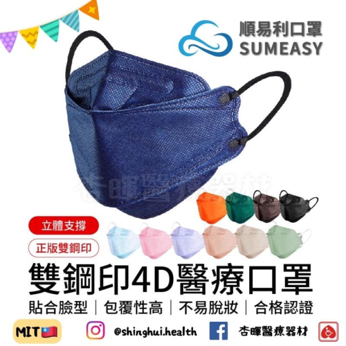 ❰現貨免運❱ 順易利 4D醫療口罩 10入 30入 醫用口罩 魚型口罩 醫療口罩 KF94 台灣製 成人口罩 立體口罩 防疫 口罩 ✅台灣製造🇹🇼 ✅實體店面 ✅原廠公司貨 ✅合法藥商許可 📍規格 ▫️10入 / 30入 📍顏色 ▫️素色藍|松竹綠|艾瑪士橘|奶茶色|極簡黑|白色 🥇符合國家認證標準 🥇貼合臉型包覆性高 🥇立體支撐不易脫妝 🥇親膚透氣配戴舒適 🥇四層防護阻隔髒污 🔺符合國家標準🔺 專業合格檢驗報告 台灣製造品質安心 🔺魚形設計包覆🔺 立體剪裁貼合臉 側邊也不易露出 🔺立體不易脫妝🔺 立體支撐不易扁塌 呼吸順暢不易脫妝 🔺耳帶配戴舒適🔺 寬扁耳帶舒適不勒 四層防護阻隔髒污 🌟口罩屬於個人衛生用品,不適用消保法7天鑑賞期,恕不退換貨,下單前請慎選適合尺寸,敬請見諒! 📍注意事項 •本產品為一次性拋棄型口罩,建議勿重複使用,長時間使用後,呼吸如有異味請立即更換。 •本產品無防毒效果,勿在有毒氣或有害粉塵環境中使用,如有必要性,請務必戴上專用口單。 ●衛部醫器製壹字第006311號 ●商品名稱:“順易利” 立體醫用口罩(末滅菌) ●生產/製造商/委製商 名稱:順易利實業有限公司七堵廠 ●生產/製造商/委製商 電話:02-2432-3030、0800-02-3030 ●生產/製造商/委製商 地址:基隆市七堵區俊賢路53號2樓 ●商品原產地:台灣 ●主要成分或材料:非織物不織布、熔噴不織布、PP+EP複合纖維。 ●度量/販售數量/販售規格:一盒10入、一盒30入 ●製造日期:2021/12/11 ●進口商名稱(台製口罩則免) ●進口商電話(台製口罩則免) ●進口商地址(台製口罩則免) ▫️效能:限醫療器材管理辦法「醫療用衣物(1.4040)j第一等級鑑別範圍。 ▫️適用:細菌過濾效率>95%,醫療院所、學校機關、工廠作業騎車與一般 灰塵、花粉飛塵、家庭清潔,等場合均適用。 【販賣藥商許可執照】 ✔️販售業者資料: ✔️許可證字號:雲縣藥販 字第6239012863號 ✔️公司名稱:杏暉醫療器材行 ✔️地址:雲林縣斗六市雲林路二段623號 ✔️諮詢專線:05-5370788 ✔️具量測功能之產品,其定期校正服務請賣場聊聊,有專人為您服務 📍服務時間:週一至六8:30-17:00 📍消費者使用前應詳閱產品說明書 衛部醫器製壹字第006311號 許可證種類 醫 器 醫療器材級數 第一等級 中文品名 "順易利" 立體醫用口罩 (未滅菌) 英文品名 "SUM EASY" 3D MEDICAL FACE MASK (NON-STERILE) 效能 限醫療器材管理辦法「醫療用衣物(I.4040)」第一等級鑑別範圍。 醫器規格 成人立體、兒童立體,以下空白。 限制項目 01國 產 申請商名稱 6111021086 順易利實業有限公司七堵廠 申請商地址 基隆市七堵區俊賢路53號2樓 製造廠名稱 6111021086 順易利實業有限公司七堵廠 製造廠廠址 基隆市七堵區俊賢路53號2樓 製造廠國別 TAIWAN