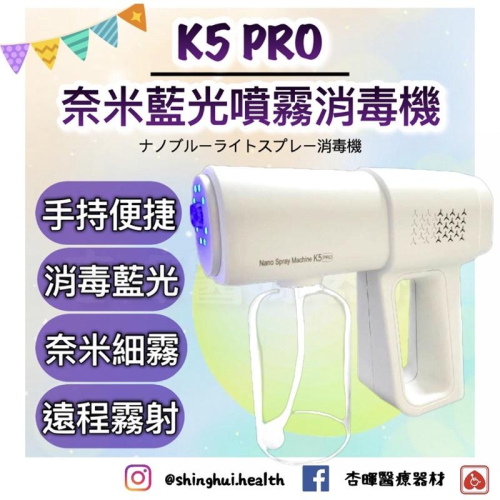 ❰現貨免運❱ 台灣現貨 K5 PRO 酒精噴霧機 酒精噴霧 防疫用品 消毒槍 奈米噴霧 霧化槍 酒精 🔸超取一件最多10 支🔸 ✅實體店面 ✅原廠公司貨 ✅合法藥商許可 K5 PRO 酒精消毒噴霧槍  🏅️FCC 、CE 、Rohs認證🏅️ ▫️瓶裝容積:380ml ▫️噴霧距離:1-1.5公尺 ▫️尺寸:223x192x65mm ▫️電壓:DC 3.7V ▫️電池容量:2000MAH ▫️功率:15W ▫️瓶裝容積:380ml ▫️噴霧距離:1-1.5公尺 ⚠️消毒槍使用小技巧 ▫️收到貨後第一時間要充電充二十分鐘以上,最好充滿電,不可以使用快充頭快充線充電,用5V1A的插頭 ! ▫️瓶子不要轉的太緊,轉緊不漏氣就可以,轉的太緊會把膠片轉到瓶口裡面去! ▫️使用過程中沒電自動停噴,請勿強行開機使用,這樣電池容易充不進去電! 【販賣藥商許可執照】 ✔️販售業者資料: ✔️許可證字號:雲縣藥販 字第6239012863號 ✔️公司名稱:杏暉醫療器材行 ✔️地址:雲林縣斗六市雲林路二段623號 ✔️諮詢專線:05-5370788 📍服務時間:週一至六8:30-17:00  📍消費者使用前應詳閱產品說明書