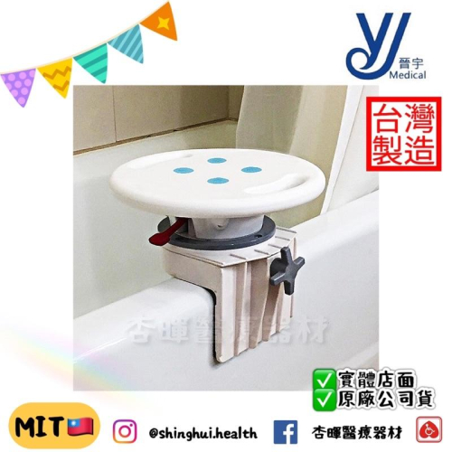 ❰免運❱ 晉宇 浴室旋轉扶手座椅 JY-0151F 台灣製造 輔具 旋轉 浴室 廁所 銀髮 沐浴 ✅台灣製造🇹🇼 ✅實體店面 ✅原廠公司貨 ✅合法藥商許可 📍產品特性 ▫️坐墊12段式旋轉 ▫️專利產品更省空間 ▫️夾具可調整寬度5.5~12.5公分 📍產品規格: ▫️材質:PE/ABS /矽膠 ▫️總高:26.3cm ▫️總寬:32cm ▫️總深:32cm ▫️限重:136kg ▫️保固:正常使用,骨架一年保固 ▫️產地:台灣 【販賣藥商許可執照】 ✔️販售業者資料: ✔️許可證字號:雲縣藥販 字第6239012863號 ✔️公司名稱:杏暉醫療器材行 ✔️地址:雲林縣斗六市雲林路二段623號 ✔️諮詢專線:05-5370788 📍服務時間:週一至六8:30-17:00 📍消費者使用前應詳閱產品說明書