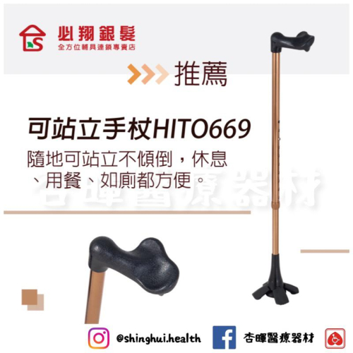 ❰免運❱ 必翔銀髮 台灣喜多 可站立式手杖 HITO669 可調高低 人體工學握把 輕量鋁合金 單手拐 拐杖 單支拐杖 銀髮輔具 ✅實體店面 ✅原廠公司貨 ✅合法藥商許可 https://s-cf-tw.shopeesz.com/file/tw-11134208-7r98w-llycpj6l0q6z4e https://s-cf-tw.shopeesz.com/file/tw-11134208-7r98v-llydyoj4hb4p8d https://s-cf-tw.shopeesz.com/file/tw-11134208-7r98p-llydyojoghp72f https://s-cf-tw.shopeesz.com/file/tw-11134208-7r990-llydyojyg32z24 https://s-cf-tw.shopeesz.com/file/tw-11134208-7r98u-llydyoj4ipp545 【販賣藥商許可執照】 ✔️販售業者資料: ✔️許可證字號:雲縣藥販 字第6239012863號 ✔️公司名稱:杏暉醫療器材行 ✔️地址:雲林縣斗六市雲林路二段623號 ✔️諮詢專線:05-5370788 📍服務時間:週一至六8:30-17:00  📍消費者使用前應詳閱產品說明書