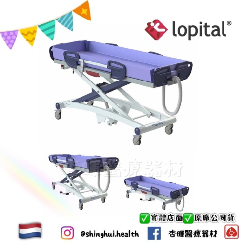 ❰免運❱ Loptial 荷蘭洗澡床系列 進口設備 沐浴床 洗澡床 銀髮輔具 電動 升降 臥床 醫院 安養院 實體店面 原廠公司貨 🔸實體店面,原廠認證,請安心購買🔸 ✅荷蘭製造🇳🇱 ✅實體店面 ✅原廠公司貨 ✅合法藥商許可 ▫️​生 產 國: 荷蘭 ▫️廠 牌: Lopital ▫️品名型號: Marina, 6100 2050 📍適 用 性: 醫院、養護機構、護理之家、教養院​ 📍​產品特性: ▫️強化結構設計,最大可乘載至227公斤 ▫️鋁製框架,減輕主機重量,搬運操作更輕鬆 ▫️採直徑150mm大輪設計,確保搬運作業平穩、順暢 ▫️電動升降操控,可調整至與床面同高,方便病患移位,減少護理人員受傷機會 ▫️床面長度可調整 ▫️兩側附2段寬度及備安全鎖控護欄,提高病患安全 ▫️床面傾斜角度調整(Anti-Trendelenburg Position),方便排水 ▫️床面採抗菌處理,方便清潔 ▫️床骨架主體採防鏽及銀離子抗菌處理,提高使用年限 📍規格尺寸:誤差± 5% ▫️外觀尺寸:長 2260mm × 寬 810mm 高640mm ~ 1140mm ▫️床面調降高度:450mm~950mm ▫️輪子尺寸: 直徑150mm ▫️基座寬度: 740mm ▫️機身重量: 76Kg ▫️乘載重量: 227Kg ▫️充電器:100-240V AC ,50-60Hz,max.1A 📍​材質說明: ▫️框架及兩側護欄:鋁+雙層粉體塗裝 ▫️鉸鍊: 鋁+雙層粉體塗裝 ▫️床墊: PVC ▫️衛部醫器輸壹字第016327號 ▫️醫療器材級數 第一等級 ▫️中文品名 "樂必妥" 沐浴搬運裝置 (未滅菌) ▫️英文品名 "Lopital" Shower Series (Non-Sterile) ▫️申請商名稱 620111A792 天群健康事業股份有限公司 ▫️申請商地址 臺北市松山區南京東路四段171號12樓 ▫️製造廠名稱 MNL0049100 LOPITAL NEDERLAND B.V. ▫️製造廠廠址 LAARAKKERWEG 9, 5061 JR OISTERWIJK, POSTBUS 56, 5060 AB OISTERWIJK, THE NETHERLANDS ▫️製造廠國別 NETHERLANDS 【販賣藥商許可執照】 ✔️販售業者資料: ✔️許可證字號:雲縣藥販 字第6239012863號 ✔️公司名稱:杏暉醫療器材行 ✔️地址:雲林縣斗六市雲林路二段623號 ✔️諮詢專線:05-5370788 📍服務時間:週一至六8:30-17:00 📍消費者使用前應詳閱產品說明書