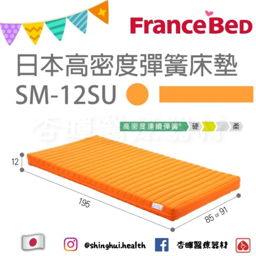 ❰免運❱ 日本 FranceBed 高密度連續彈簧床墊SM-12 SU 床墊 泡棉 電動床 床墊 服貼 輔具 ✅實體店面 ✅原廠公司貨 ✅合法藥商許可 🥇日本FranceBed 來自日本輔具大品牌フランスベッド株式会社構思設計 舒緩上升時的腹部壓迫 📍產品規格 ▫️長195、寬85or91、高9.5 (cm) ▫️床墊寬85cm:約12(kg);床墊寬91cm:約12.5(kg) ▫️輕巧彈簧床墊 ▫️床墊套可拆下清洗 🥇日本高密度彈簧床墊 適合電動床、照顧床使用 與一般泡棉床墊相比之下硬度較硬,具有高透氣性彈簧床墊,舒服睡覺一夜好眠! 【販賣藥商許可執照】 ✔️販售業者資料: ✔️許可證字號:雲縣藥販 字第6239012863號 ✔️公司名稱:杏暉醫療器材行 ✔️地址:雲林縣斗六市雲林路二段623號 ✔️諮詢專線:05-5370788 📍服務時間:週一至六8:30-17:00 📍消費者使用前應詳閱產品說明書