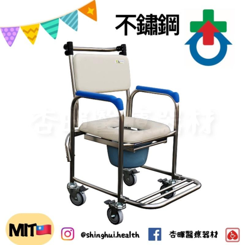 ❰免運❱ 杏華 ST020-23B 不鏽鋼 附輪便器椅 不鏽鋼 便盆椅 洗澡椅 沐浴椅 銀髮 輔具 不銹鋼 ✅實體店面 ✅原廠公司貨 ✅合法藥商許可 不可收合、固手、專利橫推把 展開:深80*寬58*高95cm 扶手至扶手內徑:45cm / 外徑: 55cm 含坐墊離地面:50cm 坐墊離扶手:19cm / 坐墊離背:40cm 坐墊離踏板:33cm 桶架離地面:38cm / 桶底離地面:25cm 重量:9.2kg / 最大承重:90kg內 台灣製造 製造日期:詳見外包裝 貨源:公司貨 便器椅 軟背 主體材質: 不鏽鋼 配件材質: PVC塑膠 ** 此商品為軟背 **  1. 材質: 主體為一吋不銹鋼(材質304)  2. 其他說明: ◎腳墊使用TPR環保可回收材質,符合環保愛地球 ◎坐墊符合: CE低毒標準EN-71 Part3 合格測試NO: Q00028717a001 ◎腳管具有排水功能 ◎專利後踏桿(專利證號:新型第M419530) ◎專業後推把(專利證號:新型第M419530號) ◎專利掀手(專利證號:新型第M415701號、專利證號:新型第M419530C號) ◎專利前踏板(專利證號:新型第M426400號) 【販賣藥商許可執照】 ✔️販售業者資料: ✔️許可證字號:雲縣藥販 字第6239012863號 ✔️公司名稱:杏暉醫療器材行 ✔️地址:雲林縣斗六市雲林路二段623號 ✔️諮詢專線:05-5370788 📍服務時間:週一至六8:30-17:00  📍消費者使用前應詳閱產品說明書