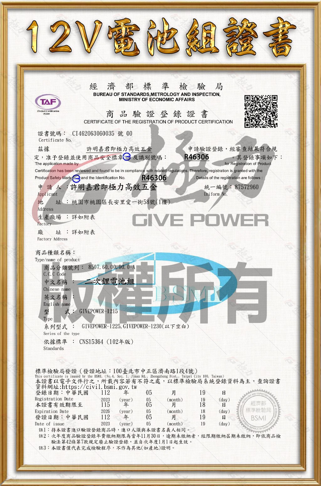 📄 12V 電池組 | 證書號碼 : CI462063060035號00