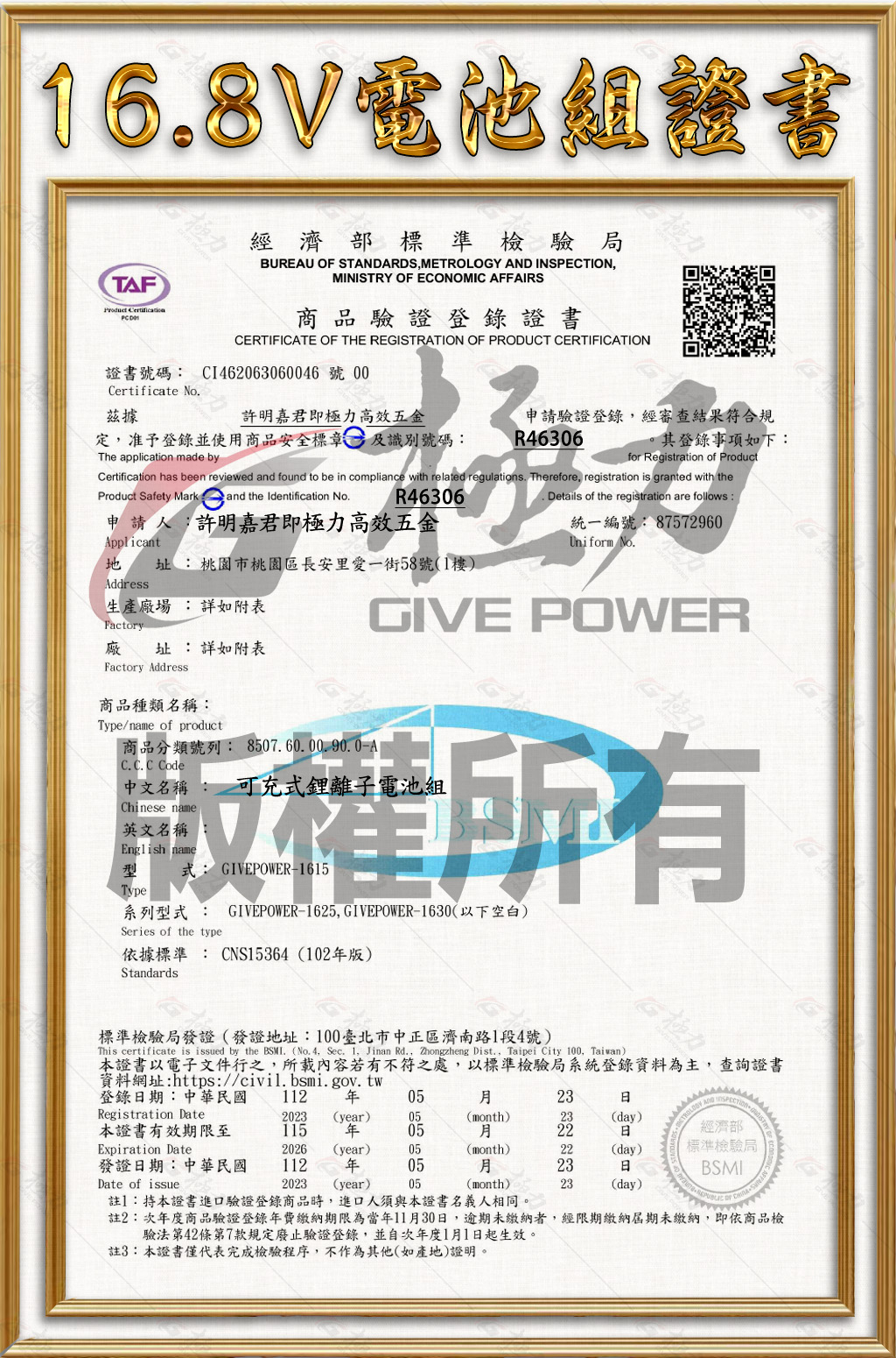📄16.8V電池組 | 證書號碼 : CI462063060046號00