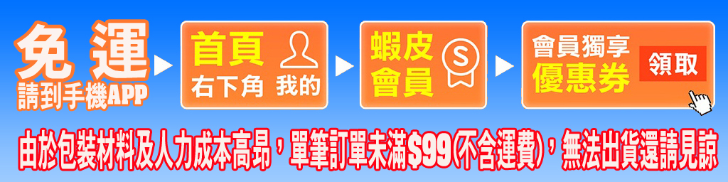 ※※因包材成本考量,訂單金額低於99元(運費另計)的訂單,恕不受理出貨,敬請見諒※※