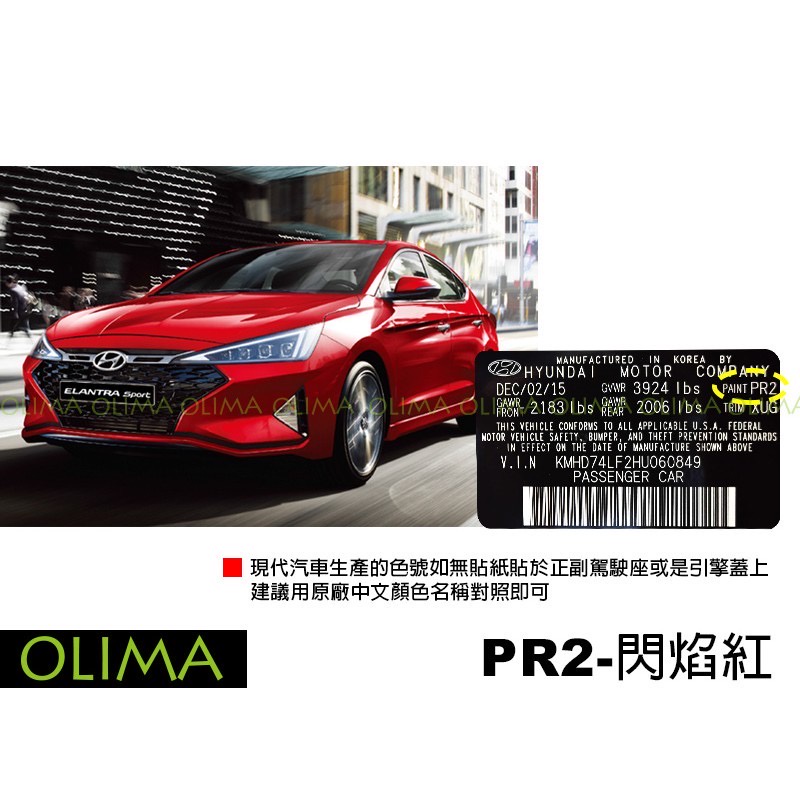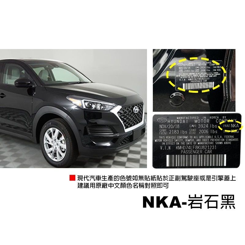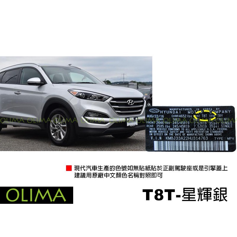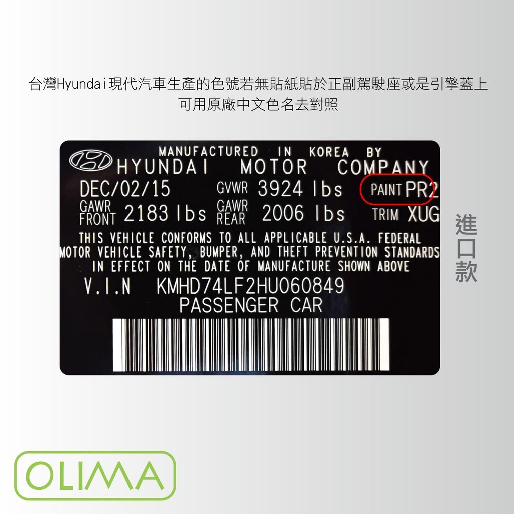 台灣Hyundai現代汽車生產的色號無貼紙貼於正副駕駛座或是引擎蓋上,直接用原廠中文顏色名稱對照即可