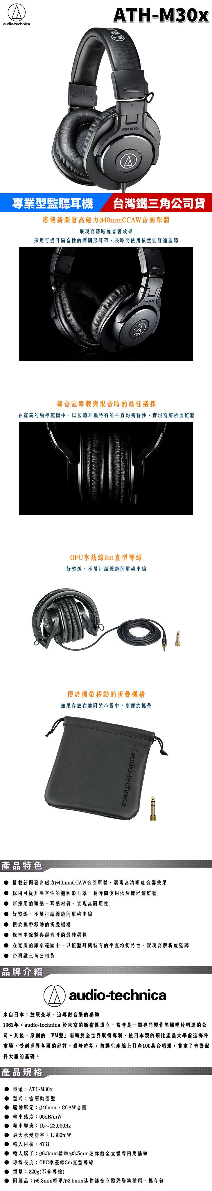 鐵三角 ATH-M30x 專業型 頭戴耳機 監聽耳機 台灣公司貨