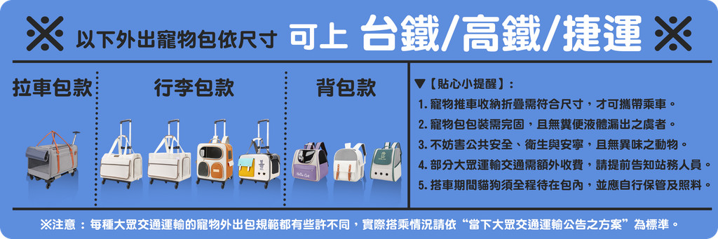 (※注意 : 每種大眾交通運輸的寵物外出包規範都有些許不同,實際搭乘情況請依“當下大眾交通運輸公告之方案”為標準。)