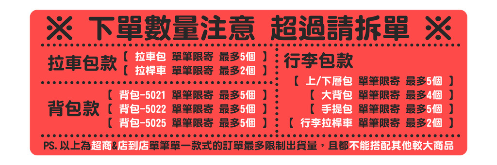 🔻如遇商品購買超量打包體積過大無法超取,需請買家配合更改寄送方式。