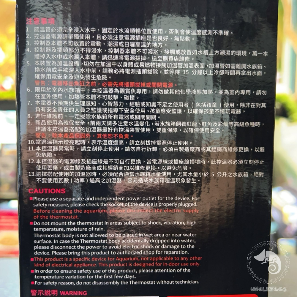 6.限用於室內水族箱中。本控溫器為觀賞魚專用,請勿做其他化學液態加熱。並為室內專用,