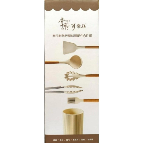 掌廚可樂膳 無印耐熱矽膠料理配件6件組 1.收納筒- 尺寸:底徑9cm*高19cm 重量:180g 材質:聚丙烯PP(耐熱120度) 2.鍋鏟 尺寸:長31.8cm*寬8.1cm 重量:75g 材質:手柄-櫸木/鏟面-(內)尼龍(外)全矽膠包覆 (耐熱200度) 3.湯勺 尺寸:長31.5cm*寬7.7cm 重量:80g 材質:手柄-櫸木/勺-(內)尼龍(外)全矽膠包覆 (耐熱200度) 4.麵勺 尺寸:長30.8cm*寬5.8cm 重量:70g 材質:手柄-櫸木/勺-(內)尼龍(外)全矽膠包覆 (耐熱200度) 5.油刷 尺寸:長27cm*寬3.7cm 重量:52g 材質:手柄-櫸木/刷頭-矽膠 (耐熱200度) 6.食物夾 尺寸:長27cm*寬3.5cm 重量:98g 材質:手柄-高級不鏽鋼+TPR/夾頭-(內)尼龍 (外)全矽膠包覆(耐熱200度)
