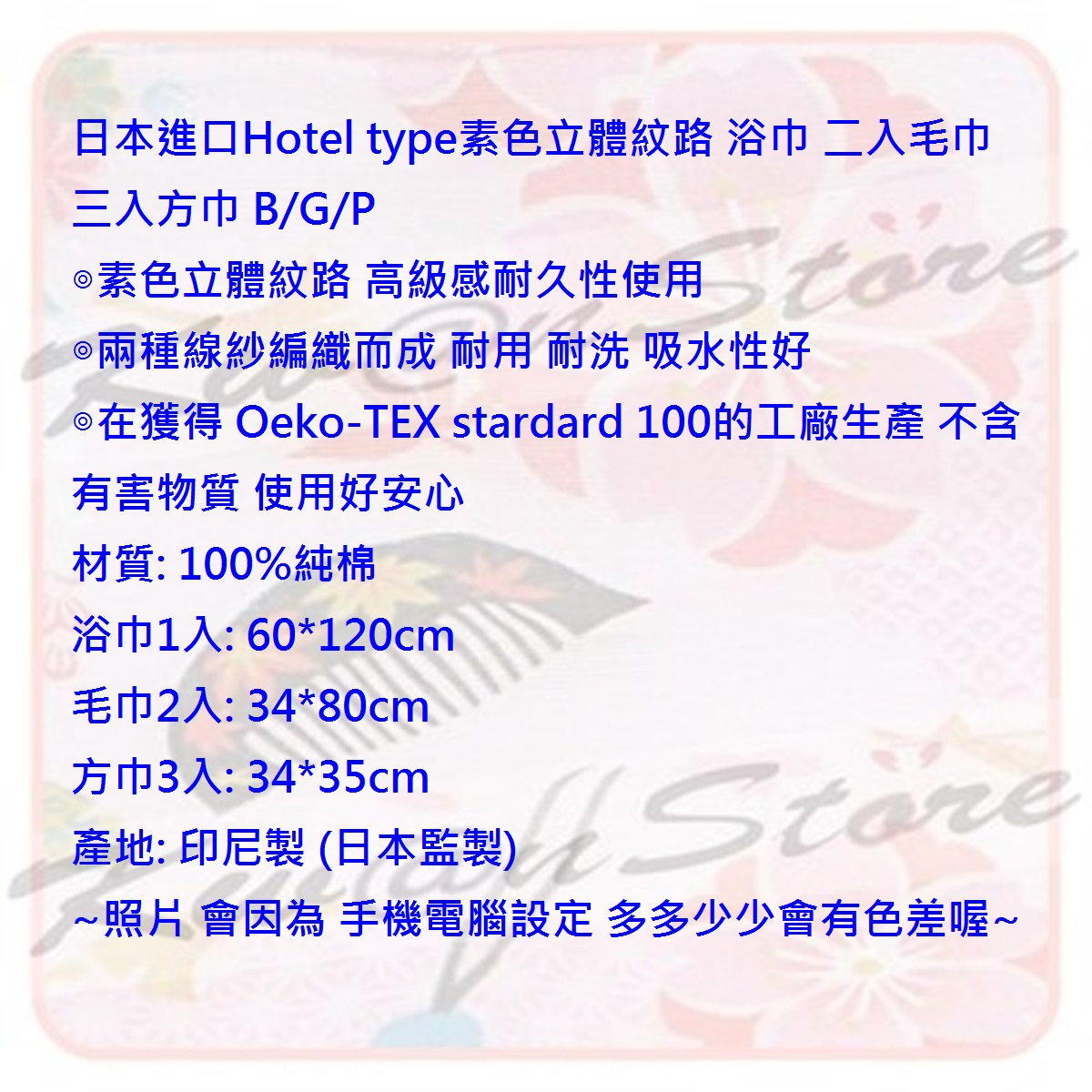 日本進口 Hotel type 素色立體紋路 毛巾 浴巾 方巾 純棉