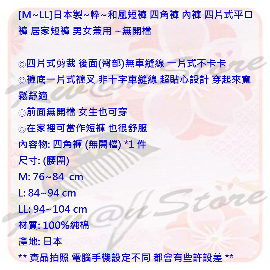 [特價][M~LL無開檔]日本製~粋~和風短褲 四角褲 內褲 四片式平口褲 居家短褲 男女兼用 ~
