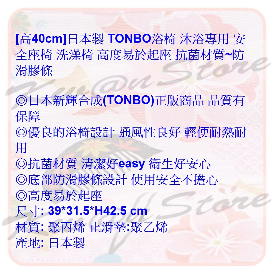 [高40cm]日本製 TONBO浴椅 沐浴專用 安全座椅 洗澡椅 高度易於起座 抗菌材質~防滑膠條