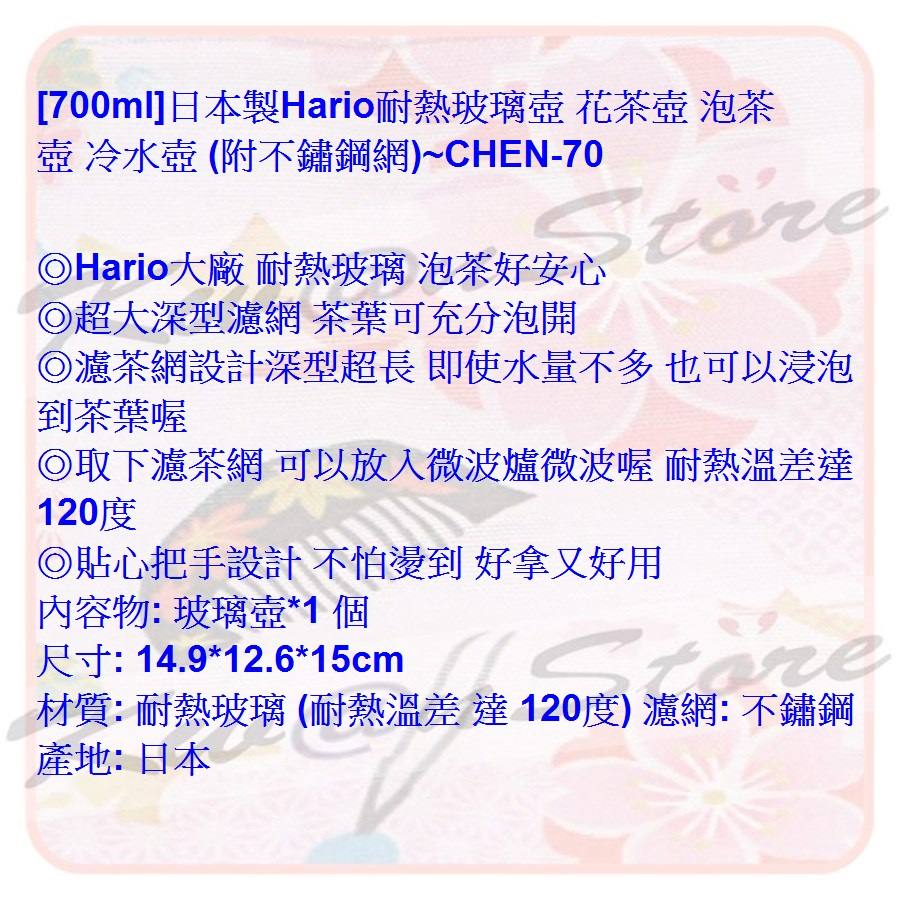 [700ml]日本製Hario(CHEN-70)耐熱玻璃壺 花茶壺 泡茶壺 冷水壺 (附不鏽鋼網)