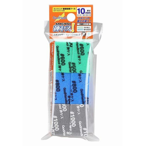 (大鳥叔叔模型) GodHand 神之手 KS10-A3B 海綿砂紙 中番數 10mm 持久的切割能力!高耐久性海綿銼! 方便的分類套件進行整理! 使用高度耐用的布銼的海綿銼。 與紙銼不同,它是布銼,因此具有多功能性,可以在各種情況下使用,例如曲面,平坦的表面處理和加工。 根據應用程序,它對應於具有陣容的各種場景。 海綿表面印有一個數字,一目了然。 由於在打印部分使用了不易滲色的墨水,因此即使用水打磨也不會使墨水融化,因此您可以放心使用。 10毫米厚的海綿比常規的Yasu硬。結合厚度,表面處理速度驚人。 “組A”包括120、240和400,它們便於粗加工和整形。 使用具有持久切削力的銼刀。 可以通過撒下切削粉來長時間使用,因此非常適合cospa。 由於它被切割成易於握持的尺寸,因此易於處理,並且在銼平小表面時也易於使用 用於天空和水的銳化 可以用海綿本身的顏色和印刷字母來識別計數 天佑!10mm厚度3種類型B ■商品號碼:GH-KS10-A3B ●質量標記 ・厚度:約10mm ・尺寸:約35mm×20mm ・計數:600×4張,800×4張,1000×4張 *規格如有變更,恕不另行通知。 注意事項 ・如果長時間浸泡在水中或使用清漆等溶劑,膠水可能會融化並脫落。 ・請將其安全地存放在小孩夠不到的地方 。請戴上安全眼鏡和防塵口罩。 ・銼刀表面的划痕和污漬在使用中不會 引起任何問題。・用力使用時,字母上的墨水可能會脫落。