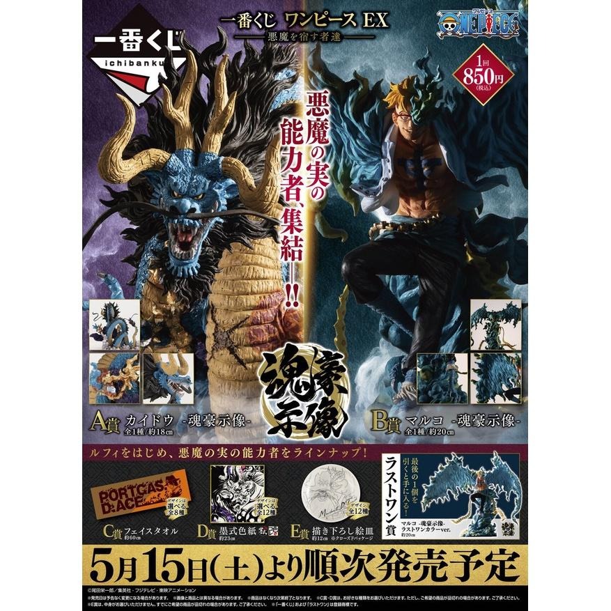 ※本商店商品消費者享有商品到貨十五天猶豫期之權益[猶豫期非使用期],但退回商品必須是全新狀態且包裝完整。 一番賞 ONE PIECE 航海王 EX 惡魔的的寄宿者們 A賞 凱多龍 海道 魂豪氏像 模型(約18cm)*3 B賞 馬爾科 馬可 魂豪氏像 模型(約20cm)*5 C賞 全套角色毛巾 (全8種約60cm)*24 D賞 墨式色紙 (全12種約23cm)*24 E賞 手繪角色小碟子 (全12種約12cm)*24 最後賞 馬爾科 馬可 魂豪氏像 電鍍塗裝 珠光色違 模型(約20cm)*1 本次以《惡魔的的寄宿者們》故事「和之國」篇章為題製作的「一番賞 FULL FORCE」,根據和之國造型所製作的角色們其魅力本就不在話下,日式和風的服裝搭配躍動感強烈的姿態令人期待!