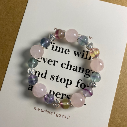 粉晶的柔和愛能量,搭配彩螢石的清透智慧能量,形成一款兼具情感療癒與心靈平衡的能量手串。溫柔的粉色與夢幻的彩色層次,不只好看,更讓日常充滿療癒氣場。