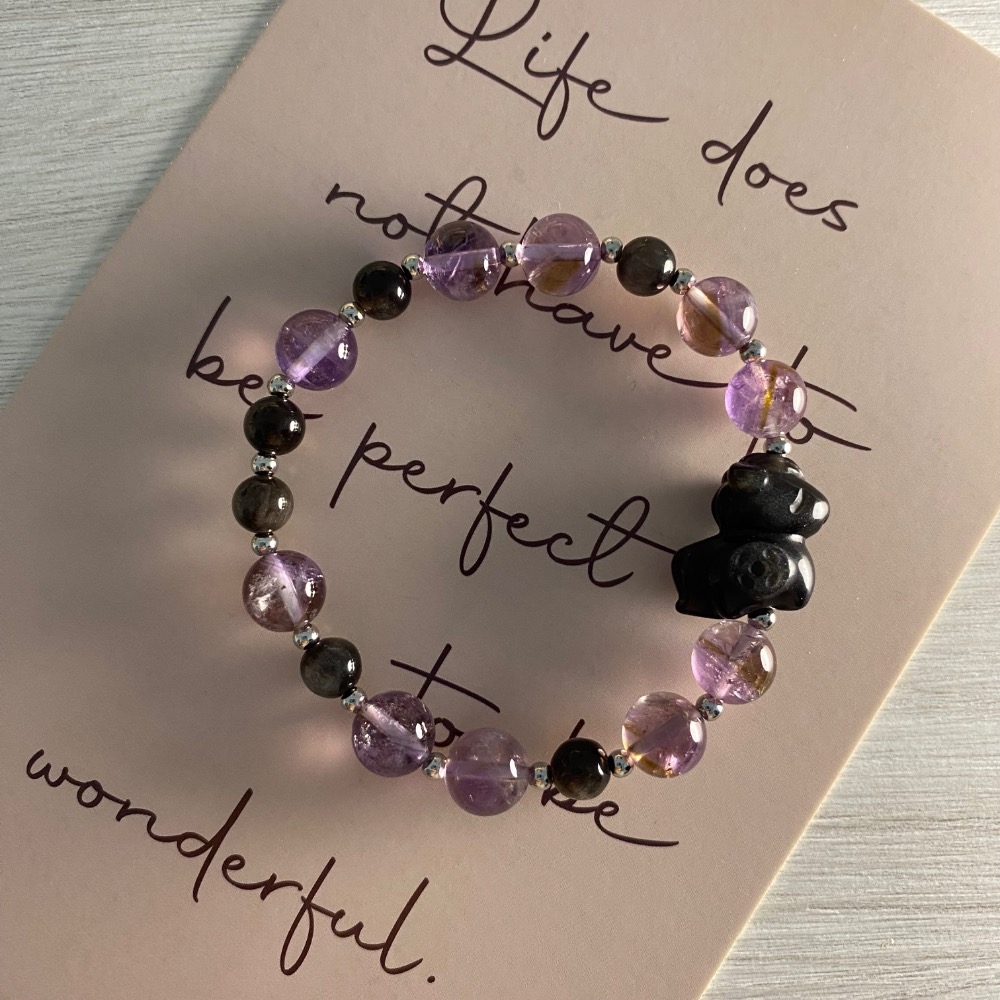沉穩神秘的銀曜石,搭配高貴稀有的紫黃晶,形成一款兼具守護、招財與智慧能量的水晶手串。深邃黑色與紫金色的對比層次,低調中帶有強大氣場,適合日常配戴,也非常有質感。