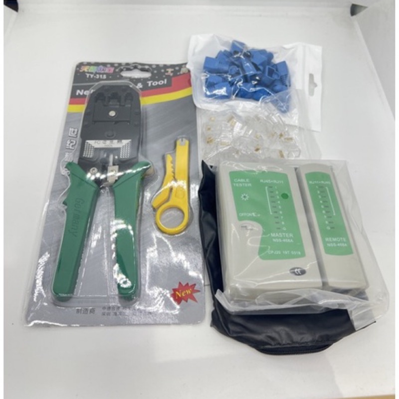(1)壓線鉗一支 (2)壓線鉗剝線器一支 (3)網路線測試器一個 (4)RJ45 Cat.5 水晶頭20PCS