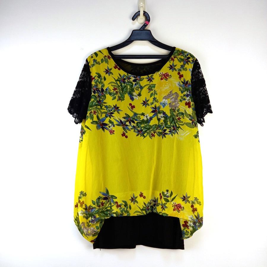 220802黃色雪紡紗黑色蕾絲袖長板上衣二手