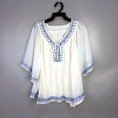220901庫存品白色藍色線條圖樣雪紡紗七分袖民族風娃娃裝M上衣