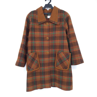 220103舊愛古著大地色格紋口袋毛料寬版及膝長秋冬大衣二手