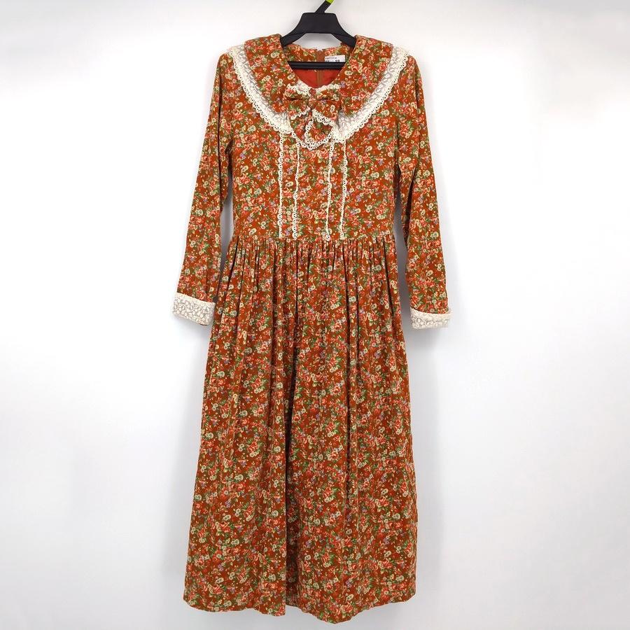 211204舊愛古著磚紅玫瑰滿版碎花燈絲絨白色蕾絲裝飾圓領蝴蝶結綁帶洋裝二手