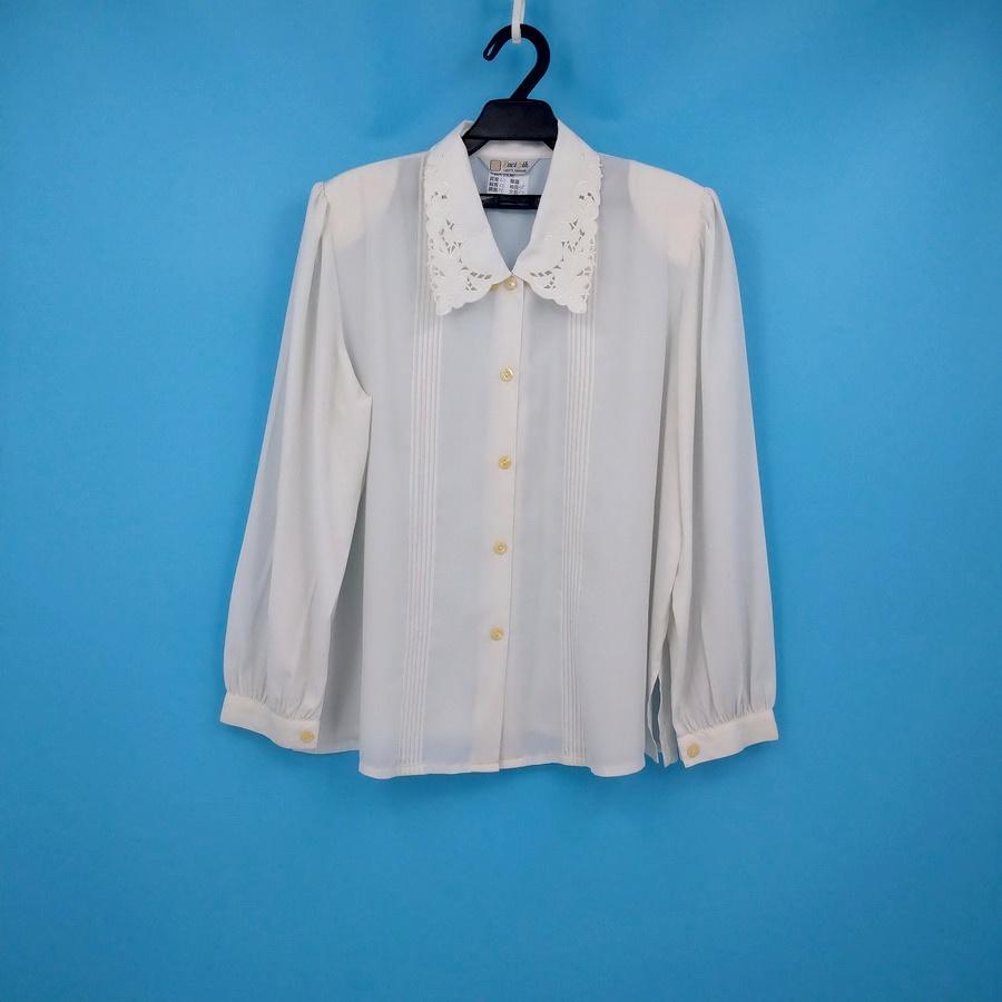 211202舊愛古著米白色電繡鏤空花朵領短長袖雪紡紗襯衫上衣二手
