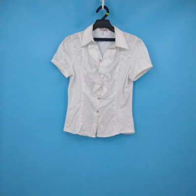 211202白色珠光緞面荷葉領腰身短袖襯衫上衣二手