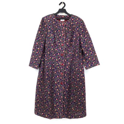 220103舊愛古著紫藍綠葉子圖樣毛料長秋冬大衣二手 一邊袖子內側有瑕疵