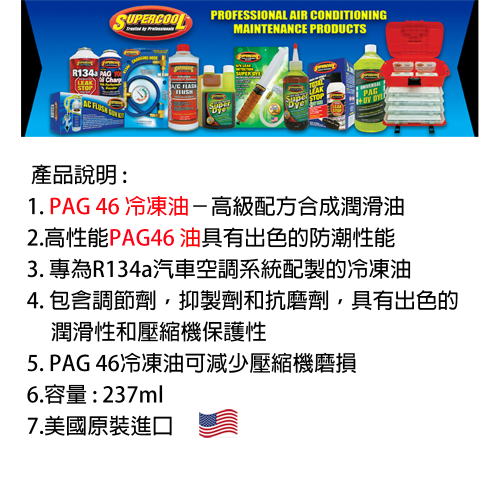【Supercool 超級冷 】PAG46冷凍油 R134a冷媒 汽車壓縮機 237ml 冷媒 汽車冷媒 汽車冷氣