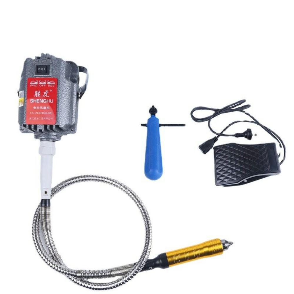 規格: 電壓:110V 馬達主機1000W 轉向:可調 正轉、逆轉 轉速:0~30000轉 腳踩調速 軟軸心6.0mm(較4.0mm耐用數倍) 手柄6.5mm大夾頭