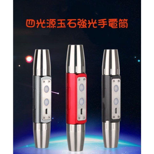 品名:四光源玉石強光手電筒 手電筒顏色:紅,灰,黑 規格: 光源:白光,黃光,紫光365,紫光395 電池:內置鋰電 四光源玉石強光手電筒包含: 玉石強光手電筒 電池(鋰電池內置) USB傳輸充電線