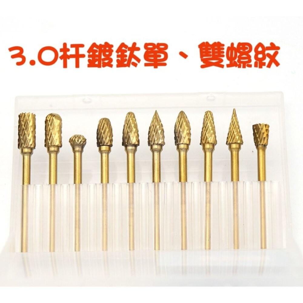 規格尺寸: 柄杆:3.0mm 全長:約43mm~51mm左右 磨頭直徑:約6mm左右 3.0杆鍍鈦單螺紋鎢鋼10支組 3.0杆鍍鈦雙螺紋鎢鋼10支組 整組賣,不拆單賣