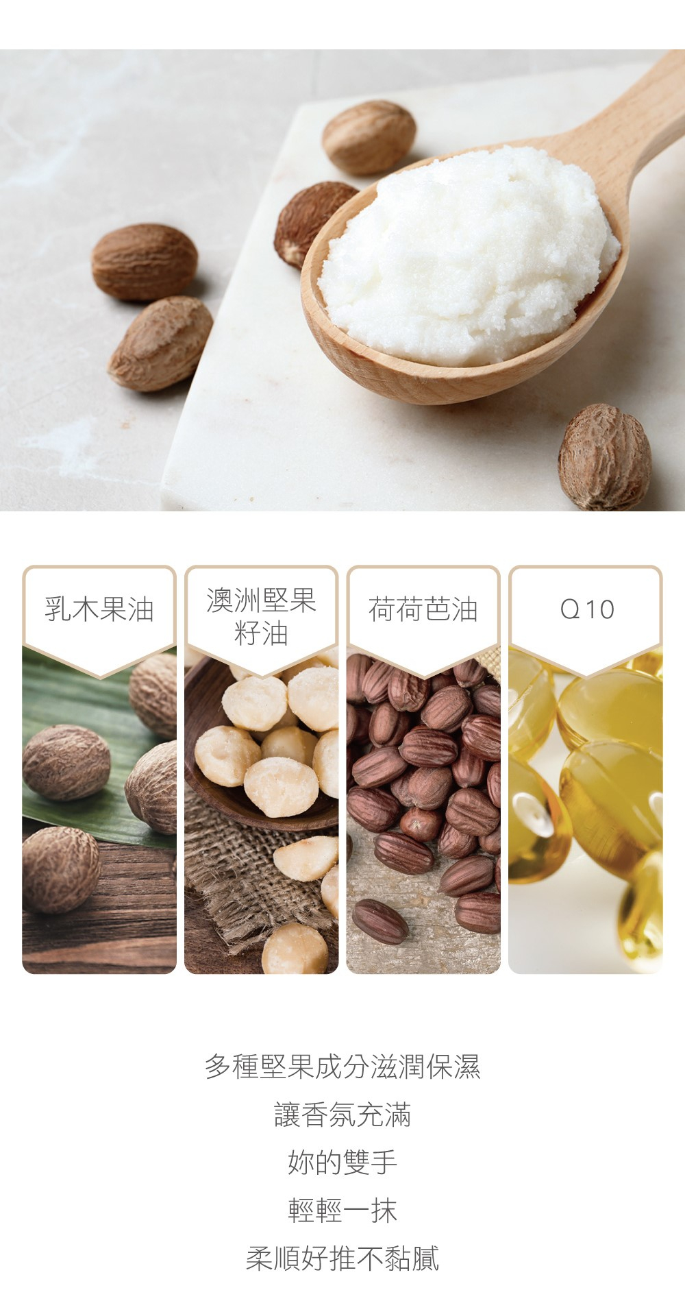 👍使用優質甜杏仁油,乳木果油與天然維生素配製,滋養指緣和滋潤雙手肌膚水份,使雙手感到絲般柔滑和柔軟