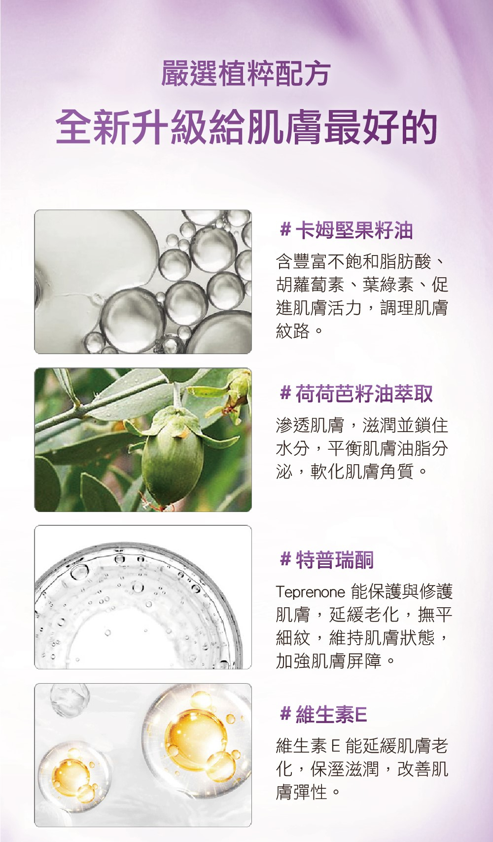 特色:嚴選植粹配方+卡姆堅果籽油=含豐富不飽和脂肪酸、