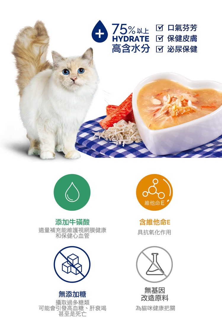 成份:水、鮪魚、銀魚、鮪魚粉、葵花䳆油、木薯澱粉、黃原膠、牛䜳酸、維他命E